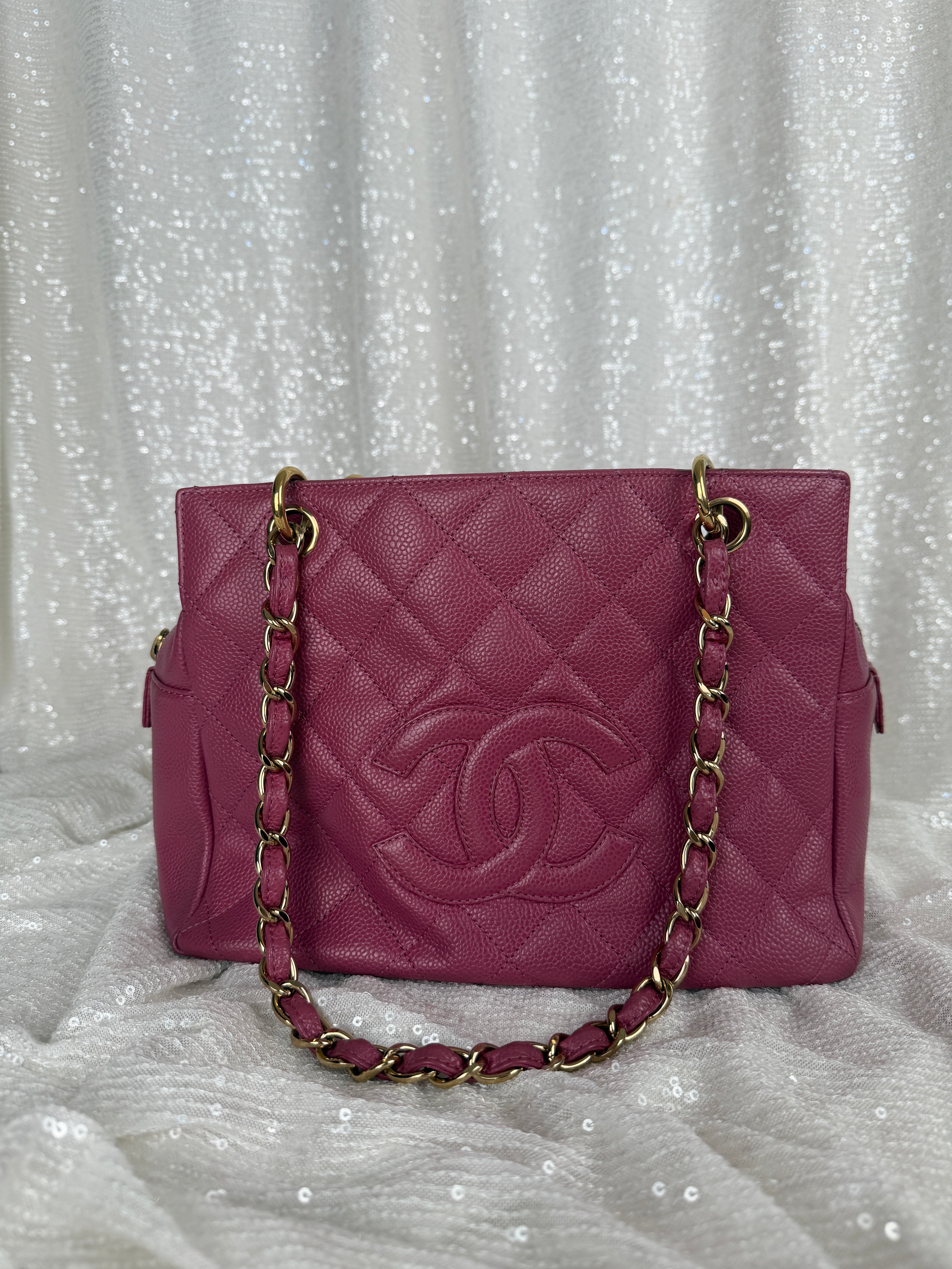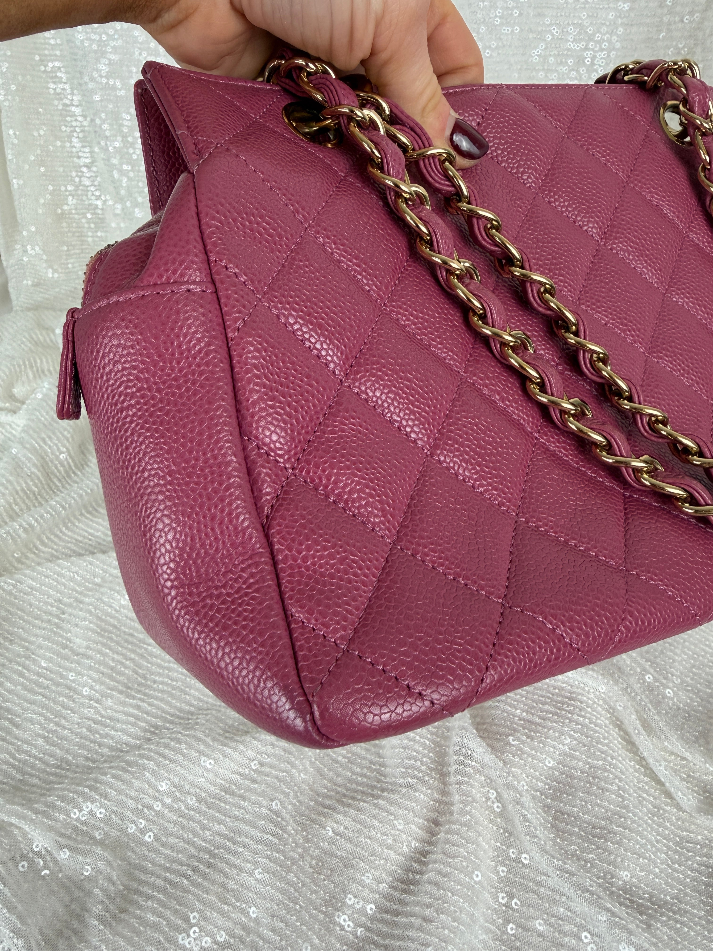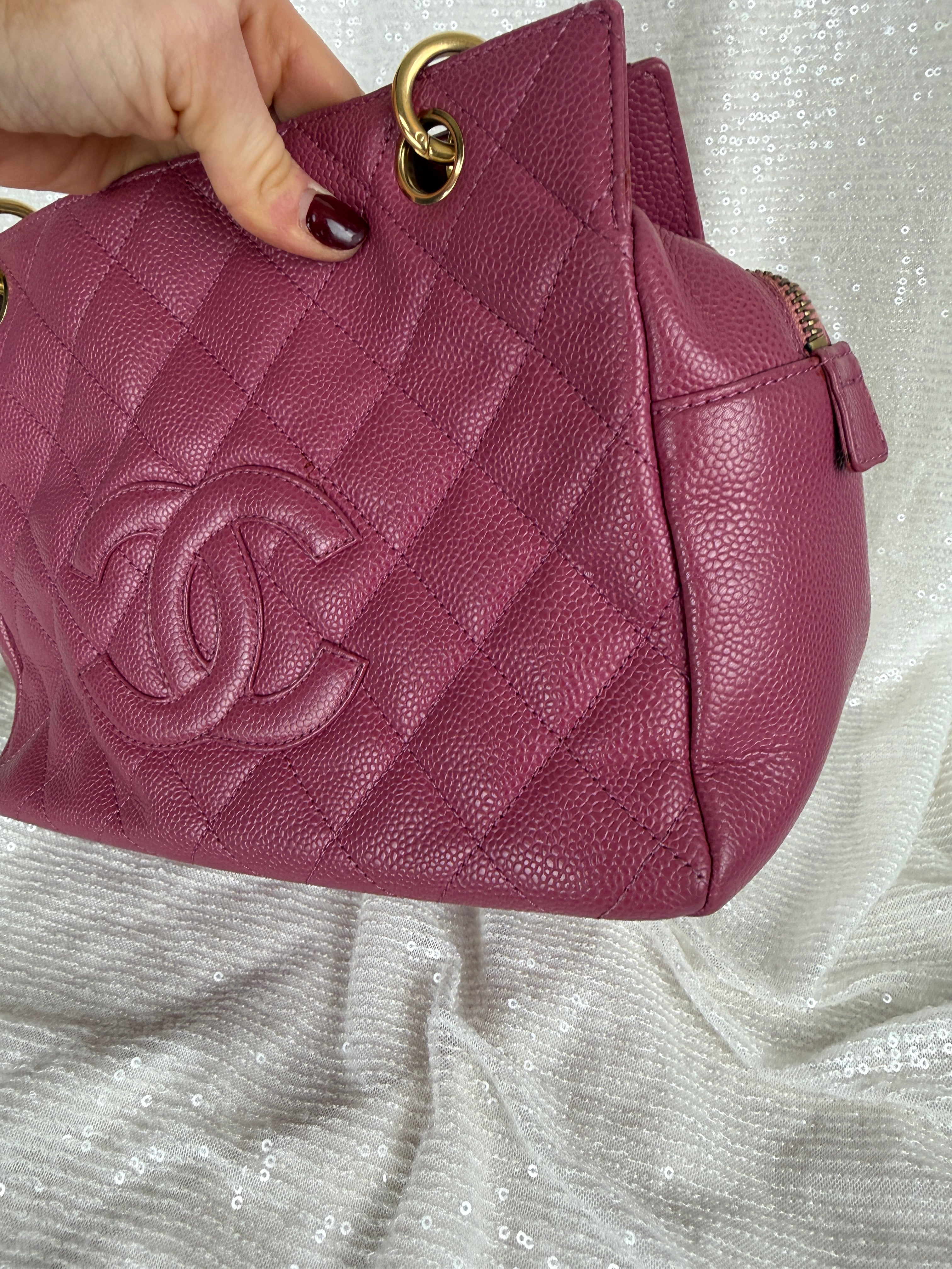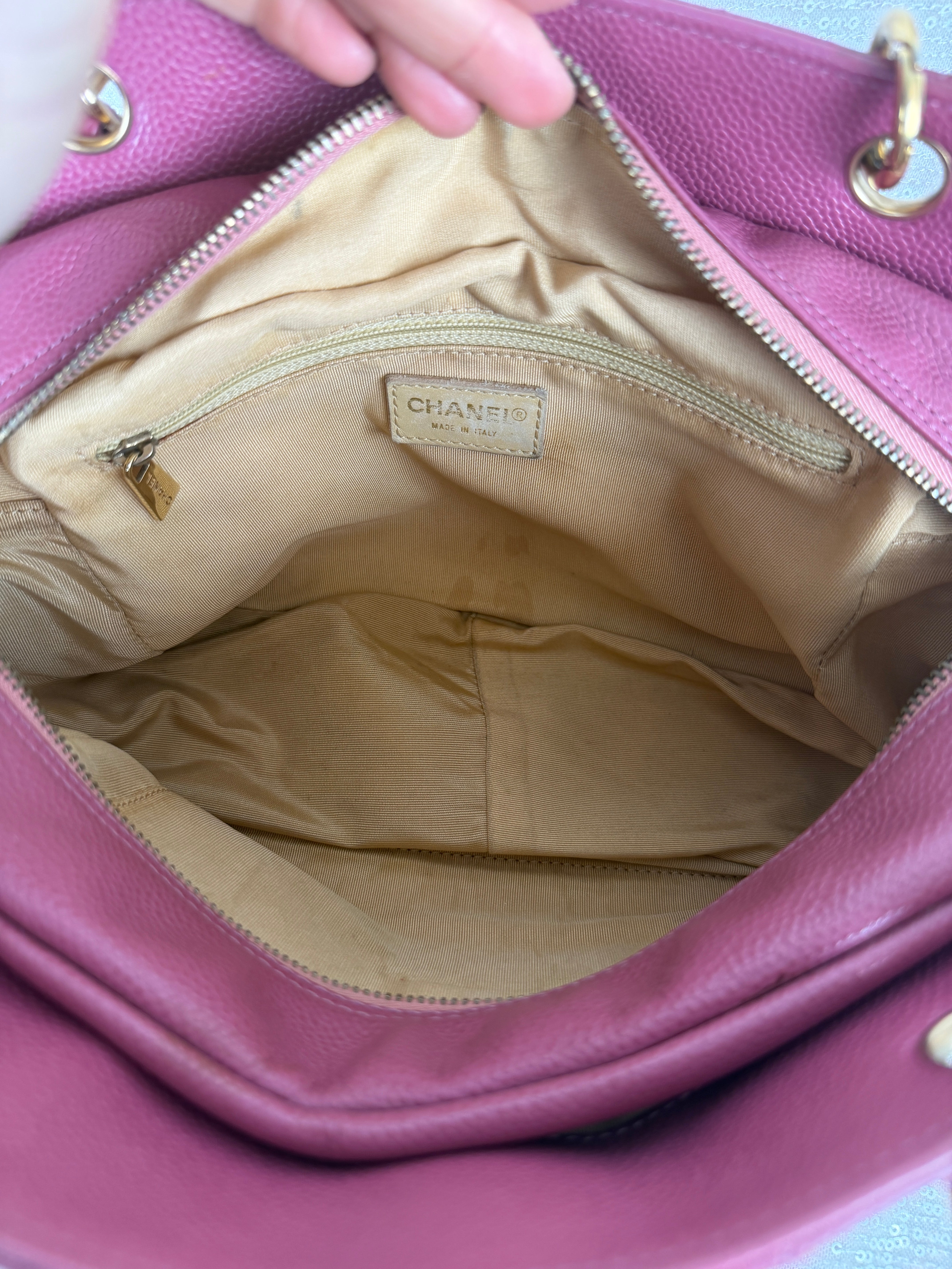 This vintage Chanel pink caviar petit tote bag features a classic CC logo, leather woven chain straps and multiple compartments. A true Y2K piece. Exterior has minor wear and relaxed shape (see photos for details) otherwise in very good vintage condition. Please note, color may appear slightly different depending on lighting.
