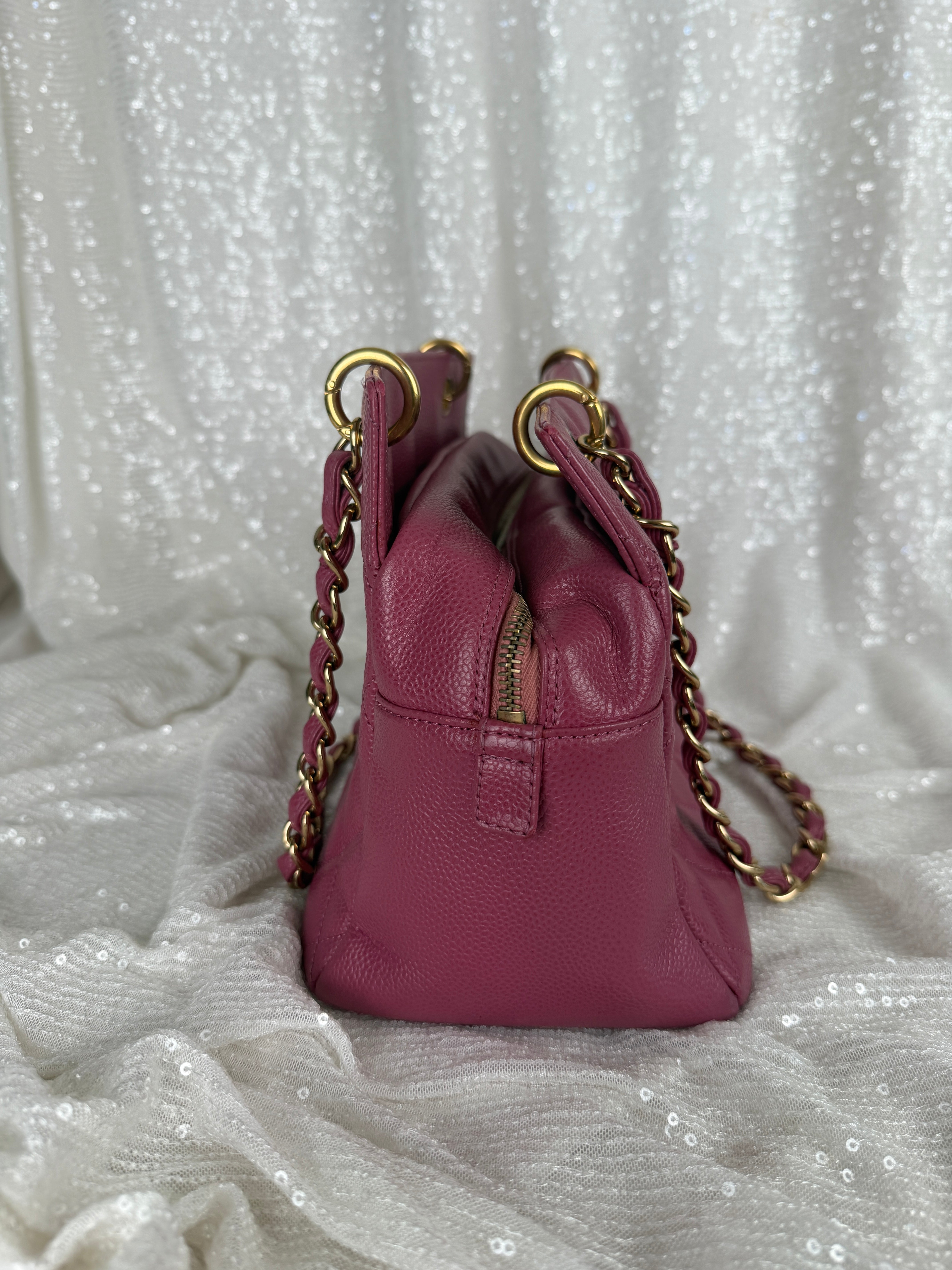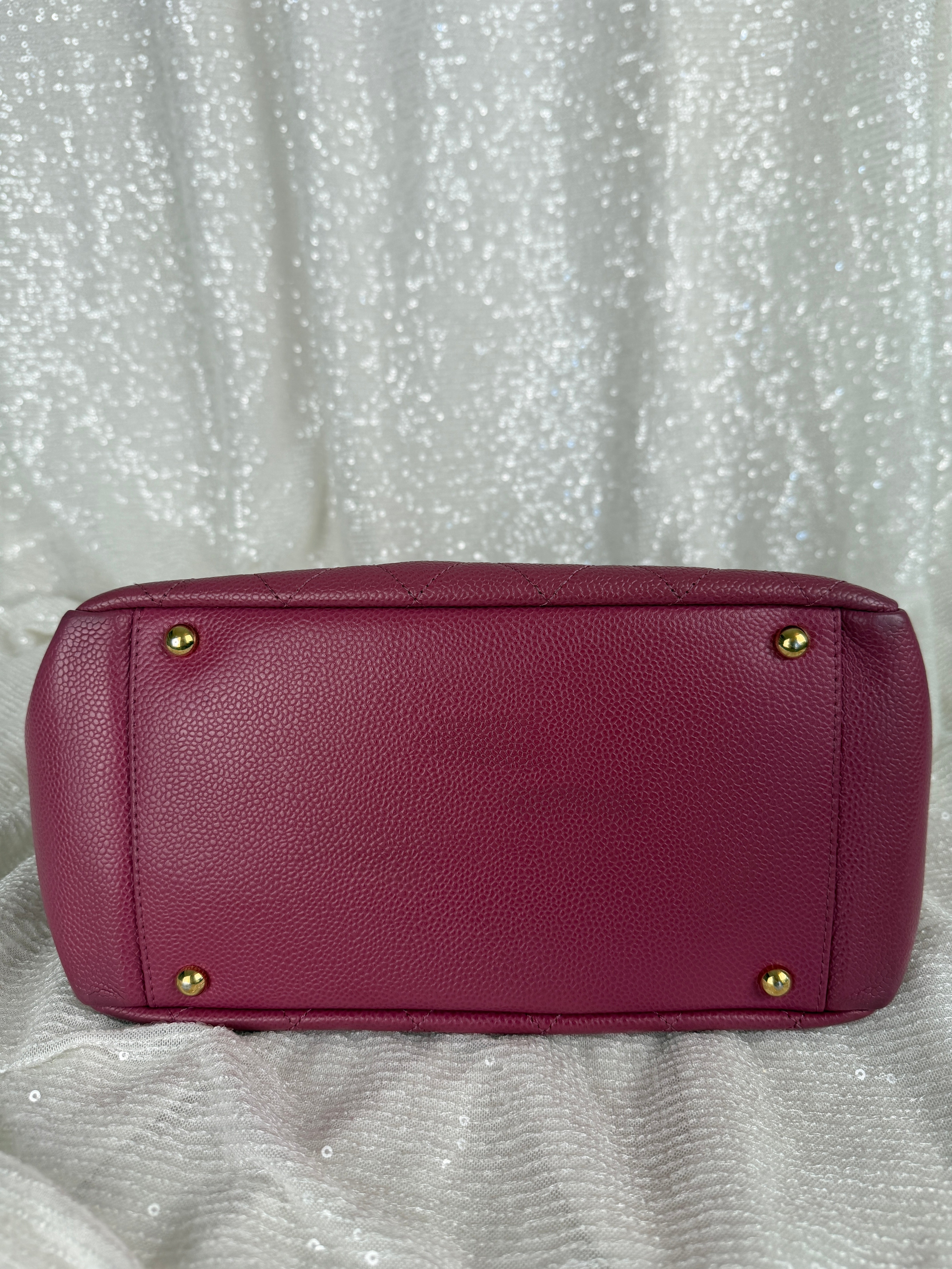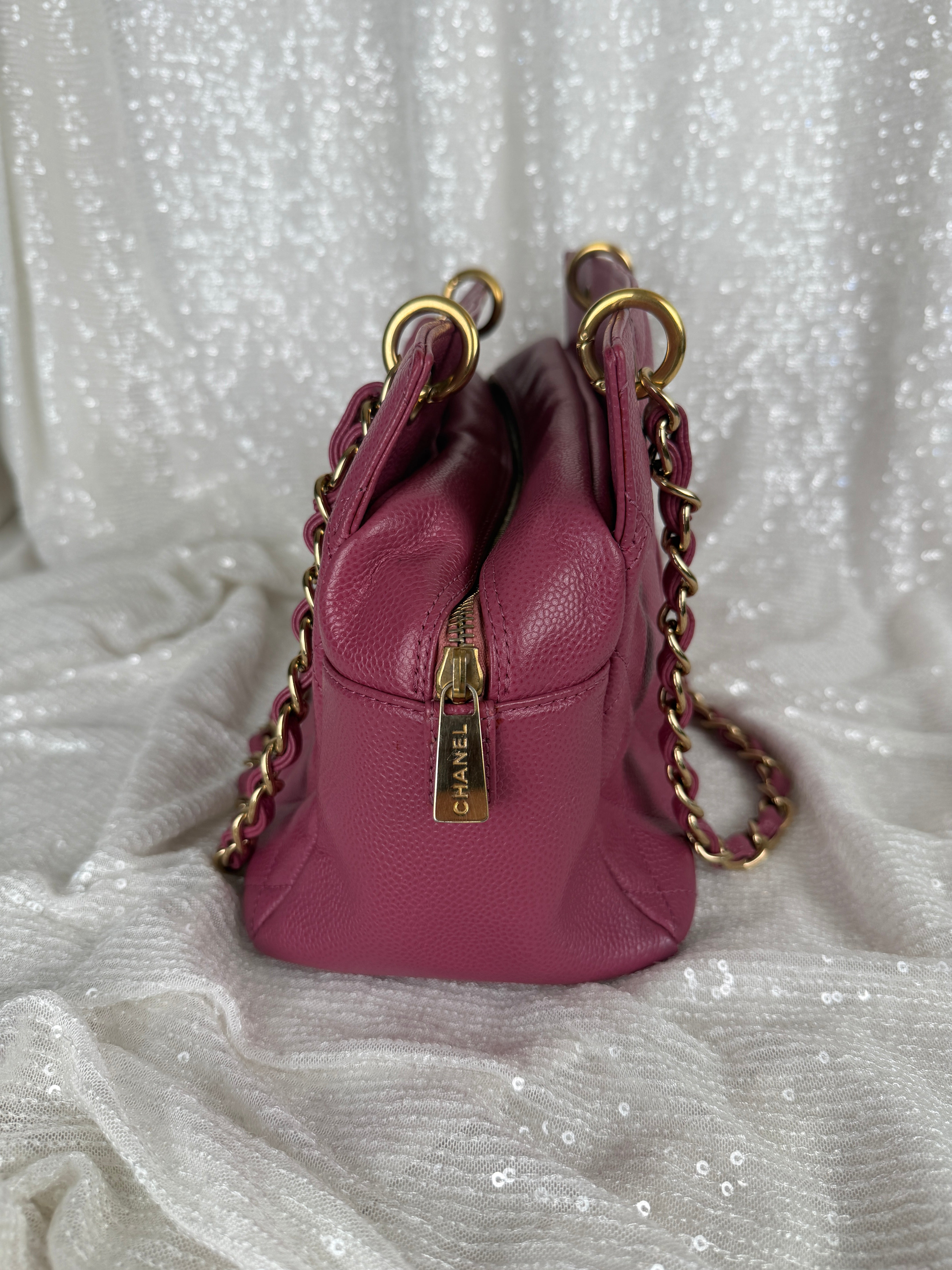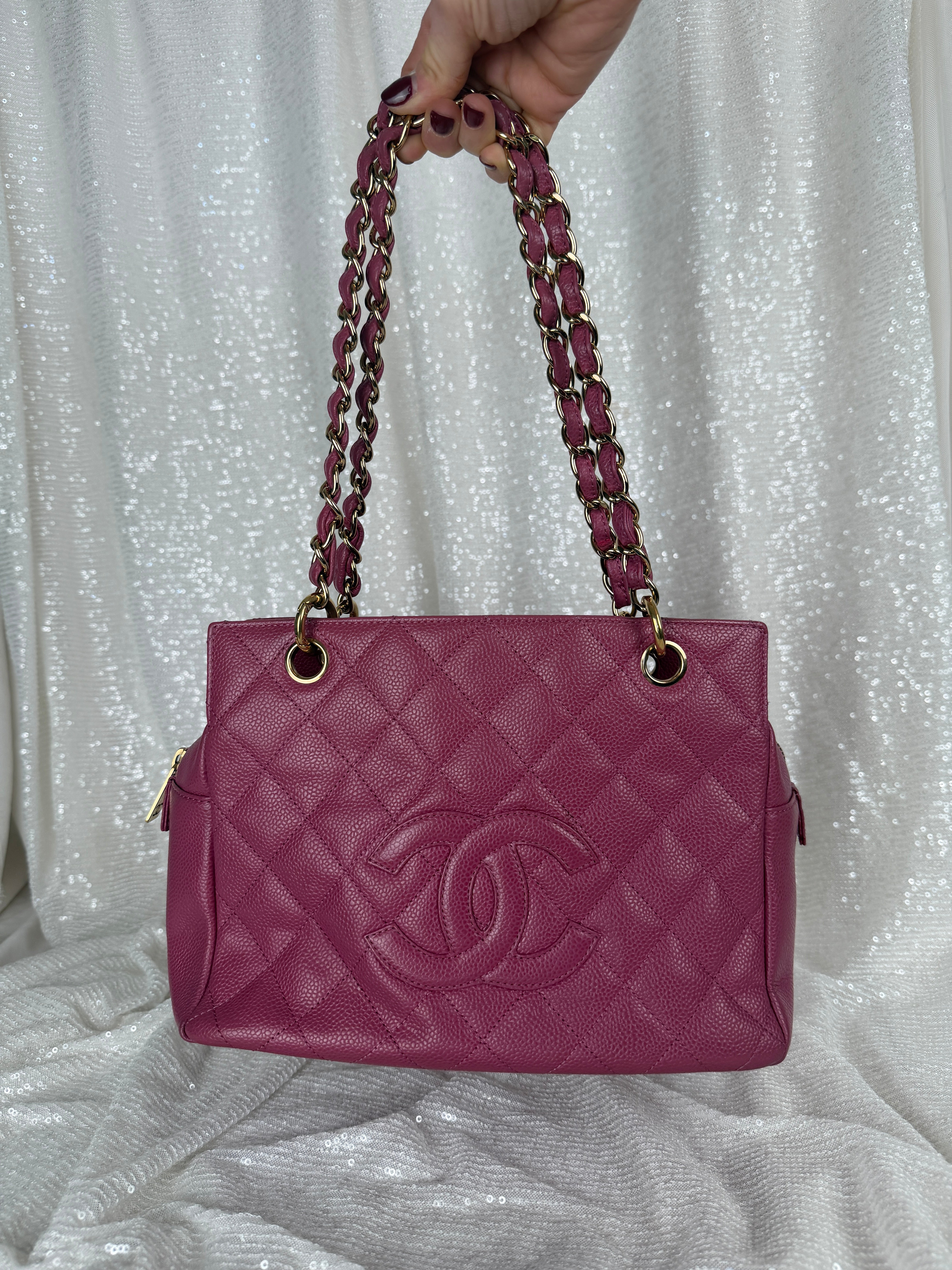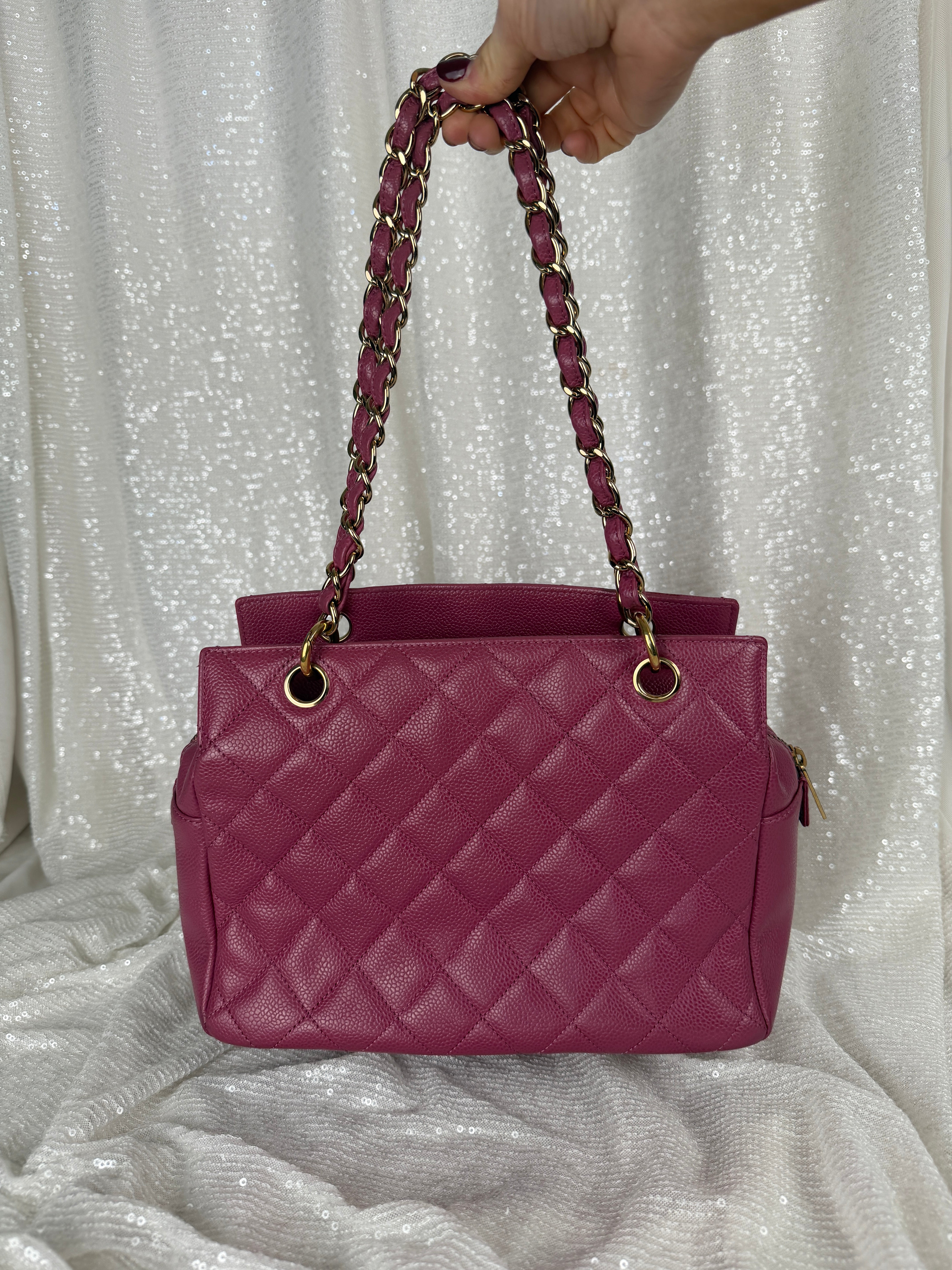 This vintage Chanel pink caviar petit tote bag features a classic CC logo, leather woven chain straps and multiple compartments. A true Y2K piece. Exterior has minor wear and relaxed shape (see photos for details) otherwise in very good vintage condition. Please note, color may appear slightly different depending on lighting.