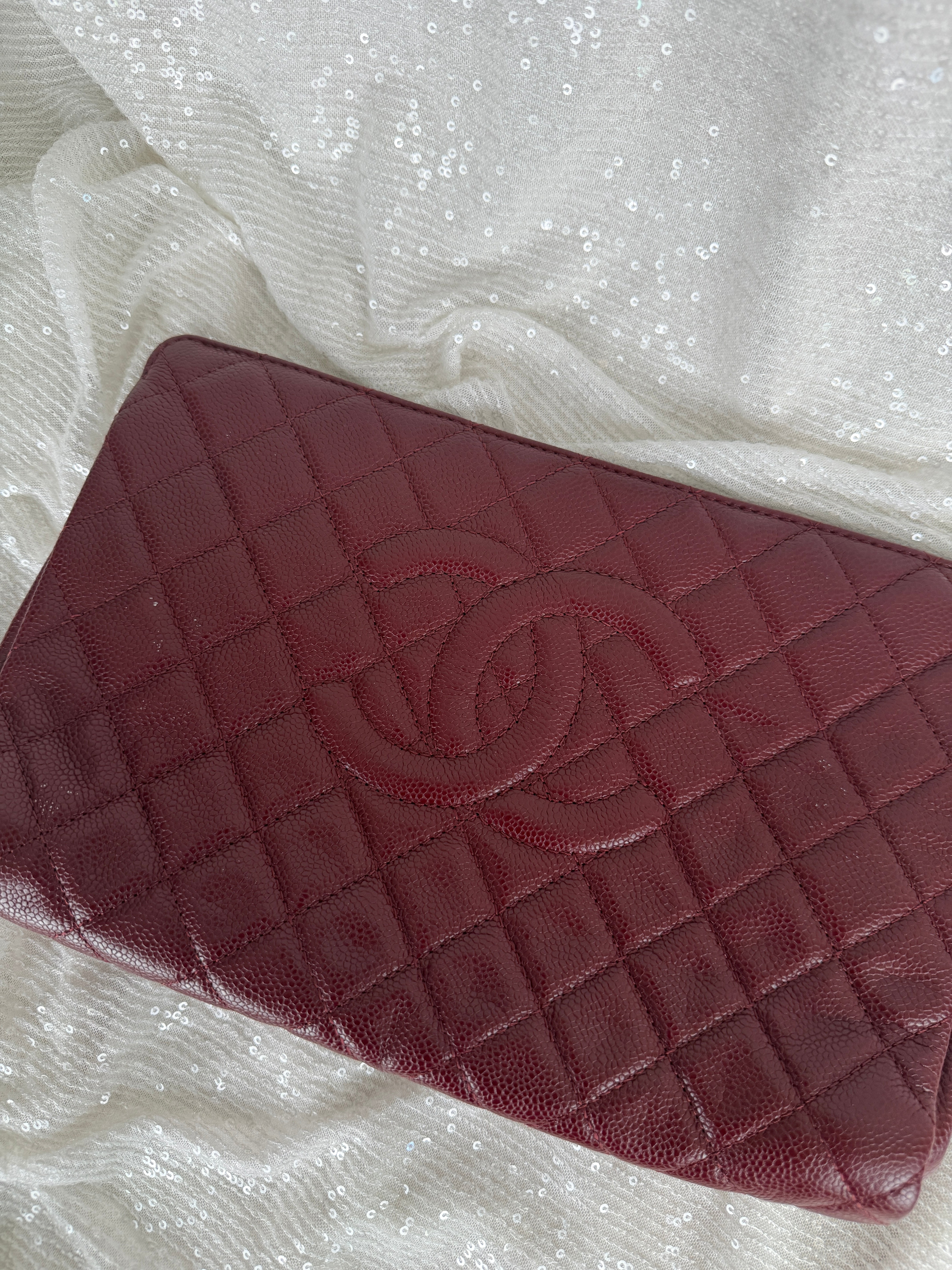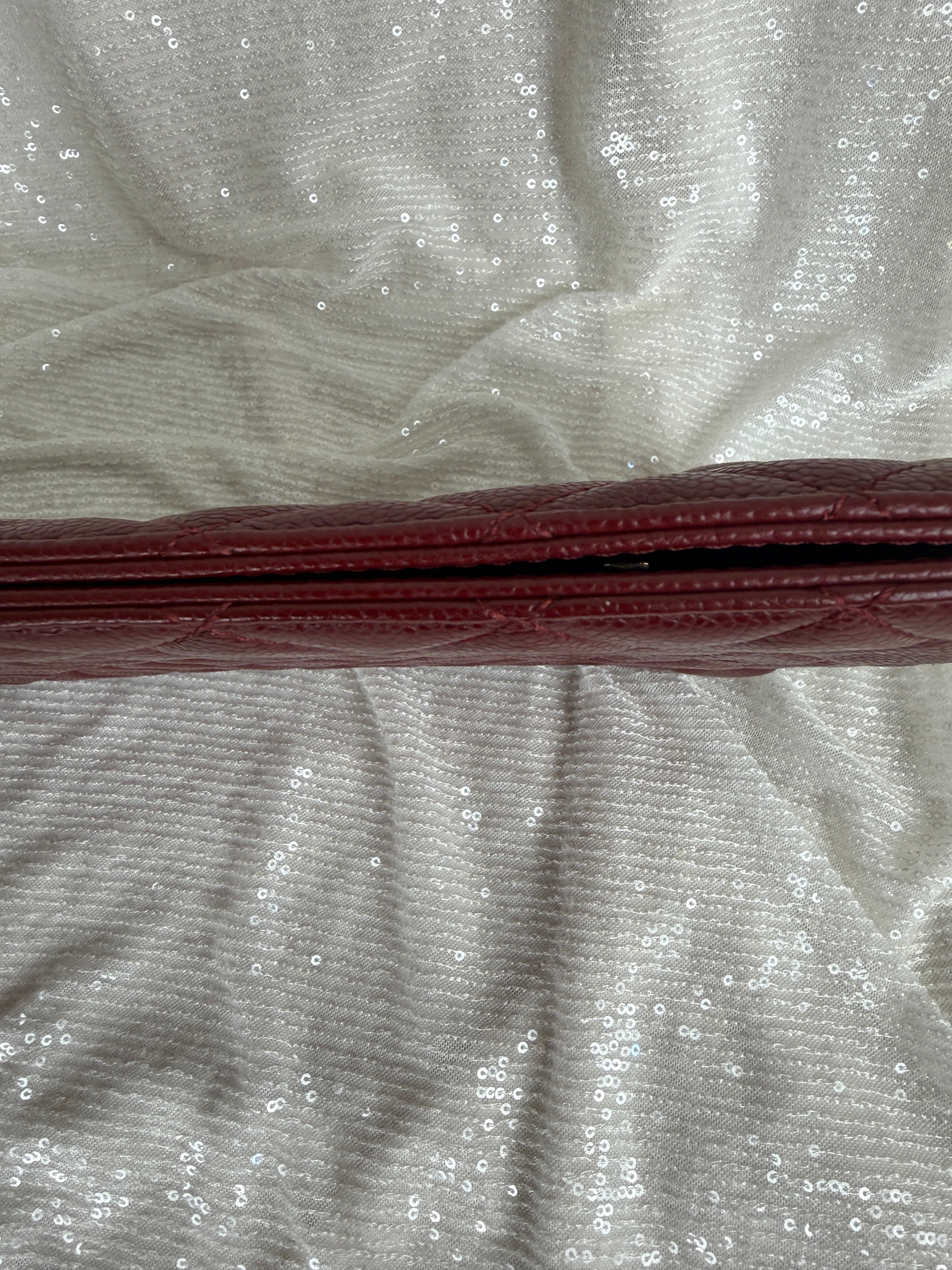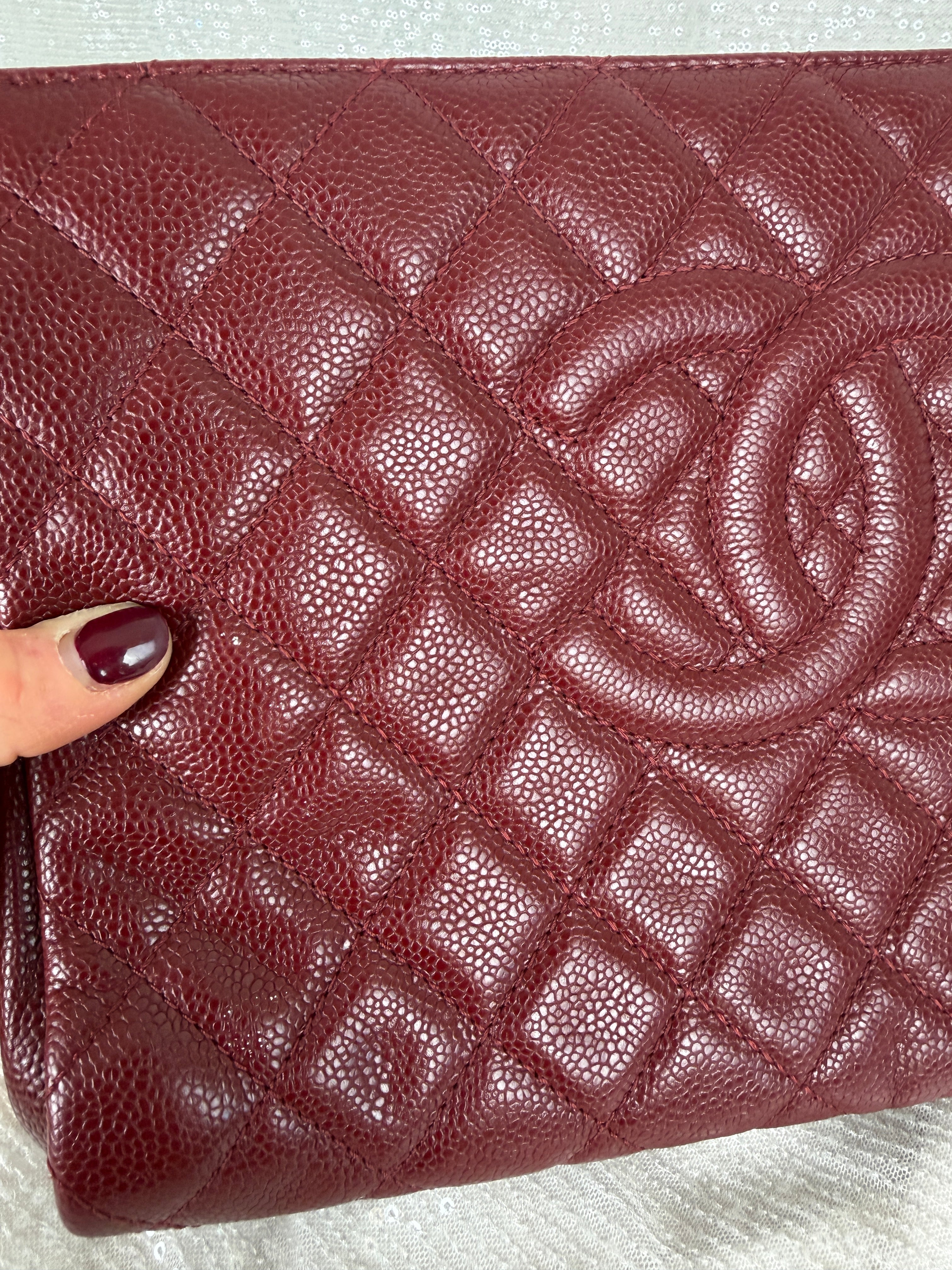 This Chanel frame clutch features burgundy tone caviar leather and a classic CC logo. Exterior has minor wear including small light marks that are more noticeable in certain lighting. See photos for details.