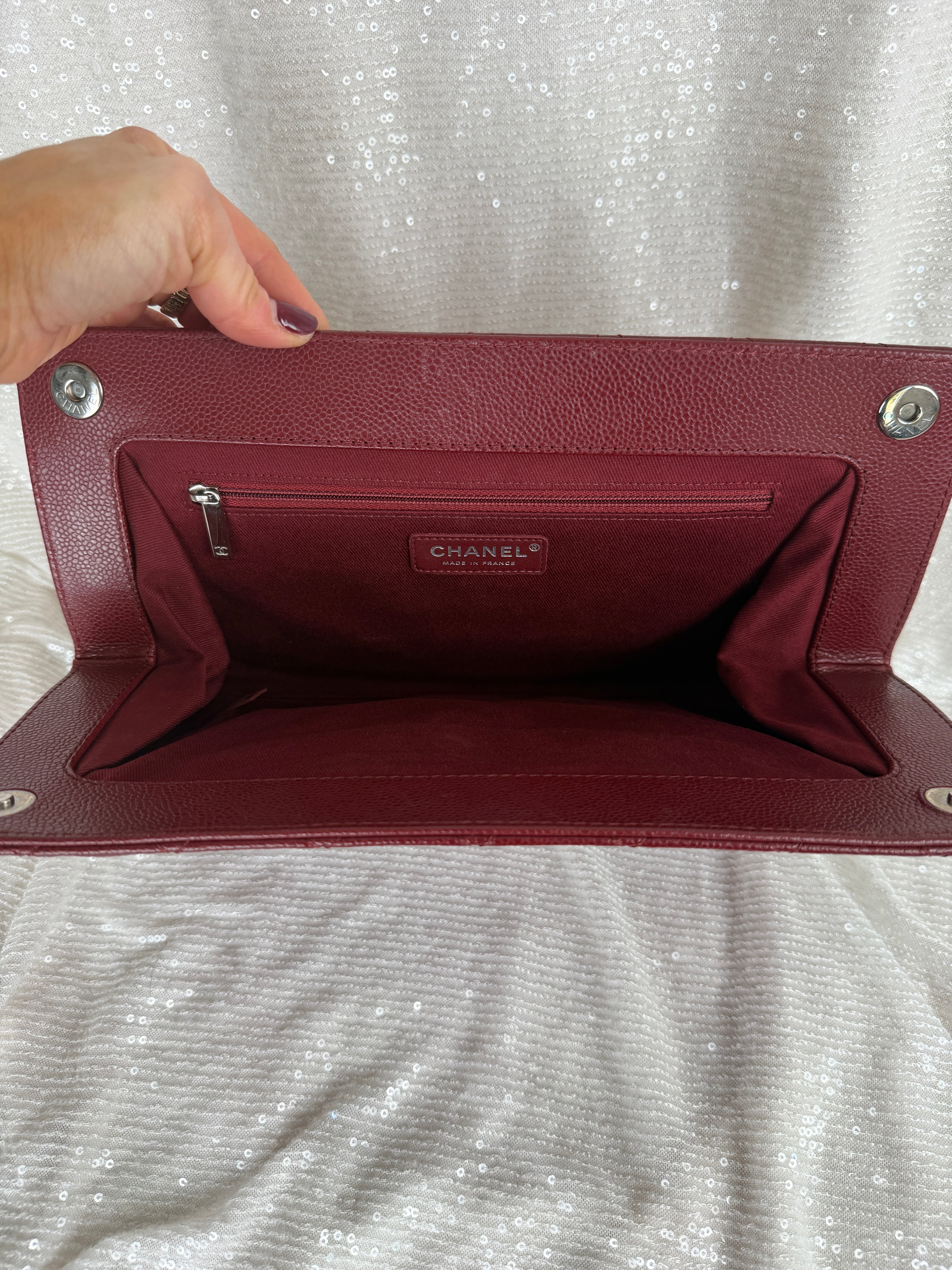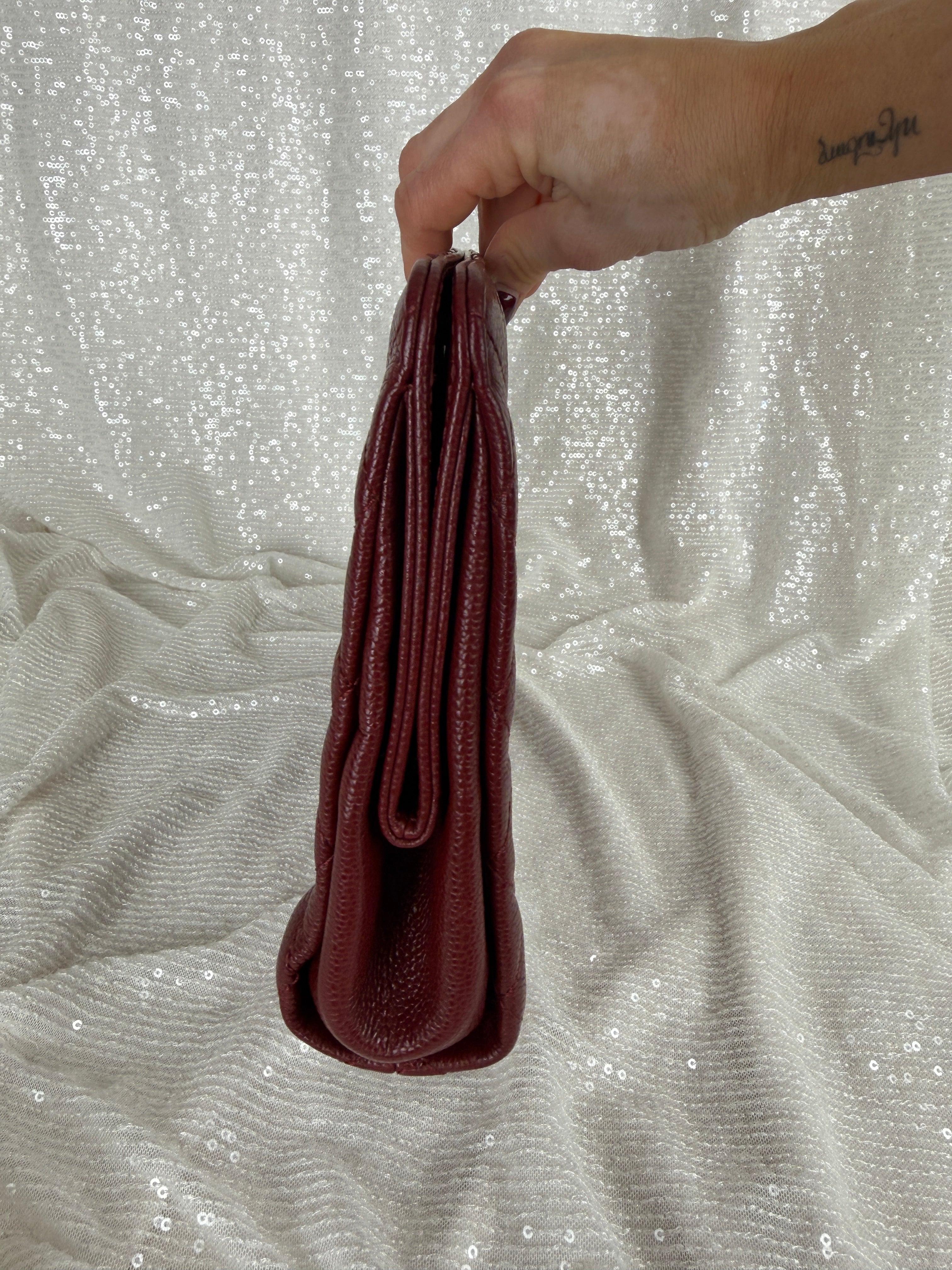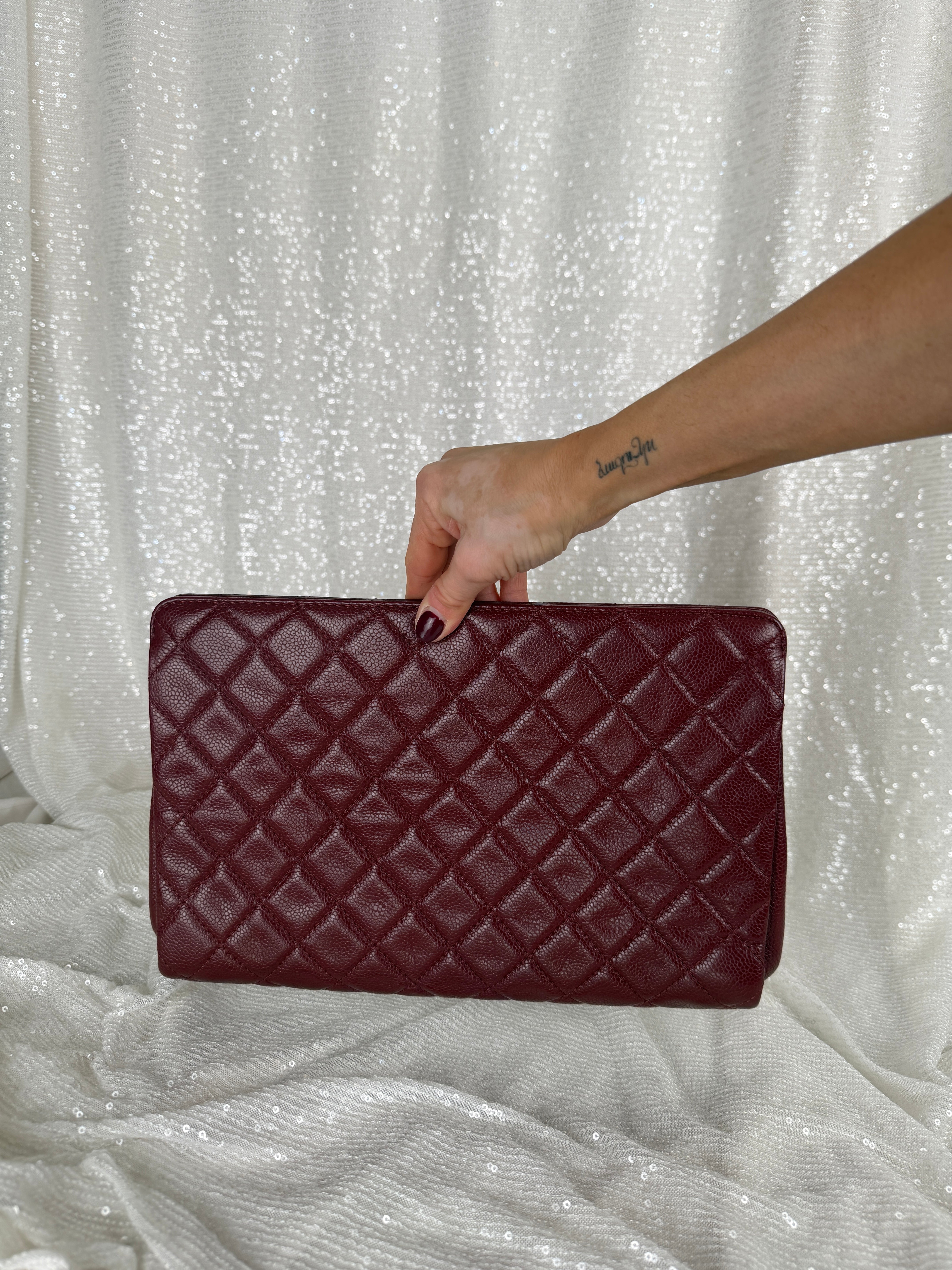 This Chanel frame clutch features burgundy tone caviar leather and a classic CC logo. Exterior has minor wear including small light marks that are more noticeable in certain lighting. See photos for details.